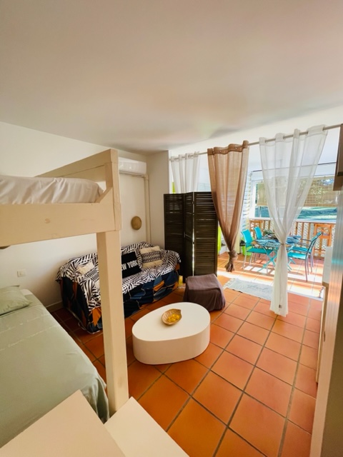 “Studio spacieux et lumineux. Récemment rénové, il est parfaitement équipé et comprend 1 chambre de 2 personnes + 2 couchages enfants en mezzanine. Idéalement placé entre la piscine et la plage”